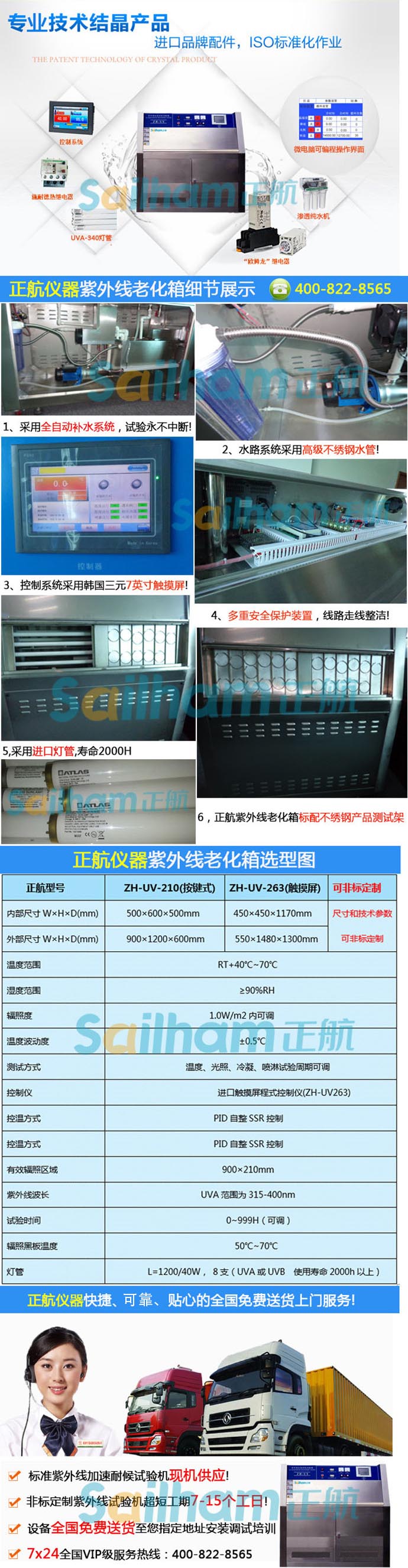 紫外老化試驗箱適用于非金屬材料的耐陽光和人工光源的老化試驗。源采用8只額定功率為40W的紫外熒光燈作發(fā)光源。紫外線熒光燈管,分布在機器的兩側,每側各4只(有UVA-340和UVB-313光源供用戶選擇配置)。
